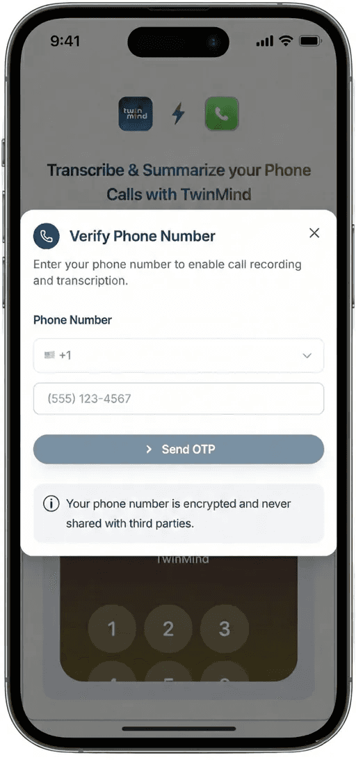 Save the TwinMind recording number as a contact in your phone. This makes it super easy to add us to calls with just one tap.