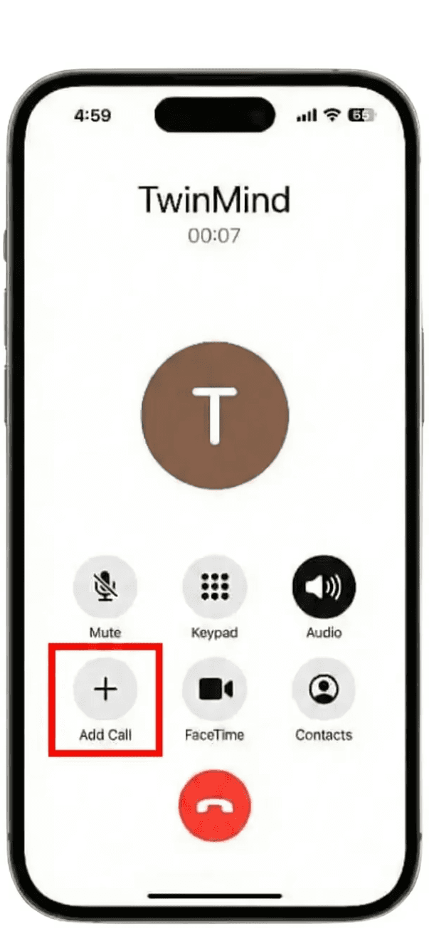 Add TwinMind to the call: Tap "Add Call", then call your saved TwinMind number. Wait for the connection. You'll hear silence.