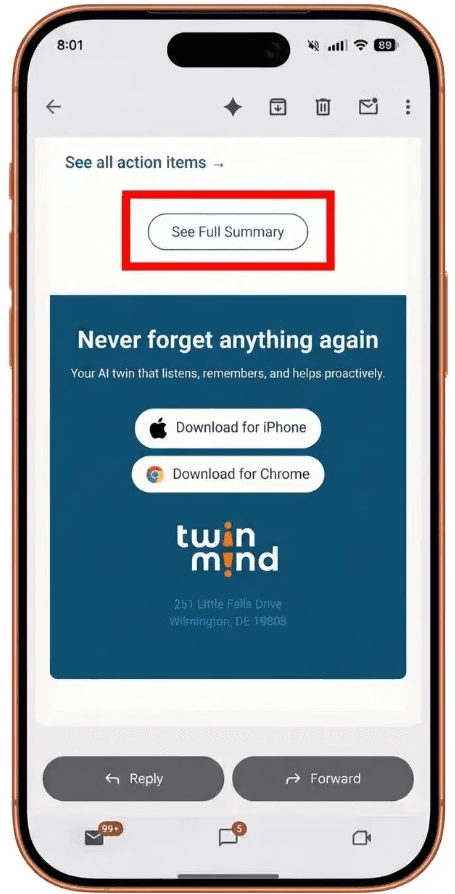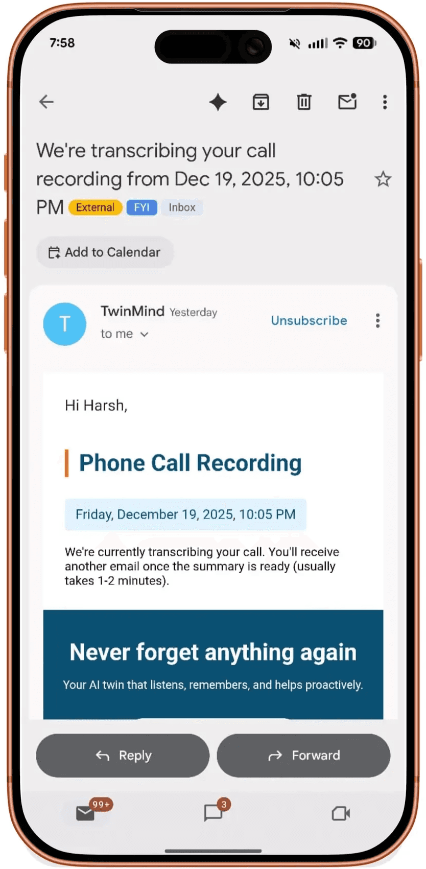 Once you hang up, TwinMind begins processing your recording. You'll receive two emails: