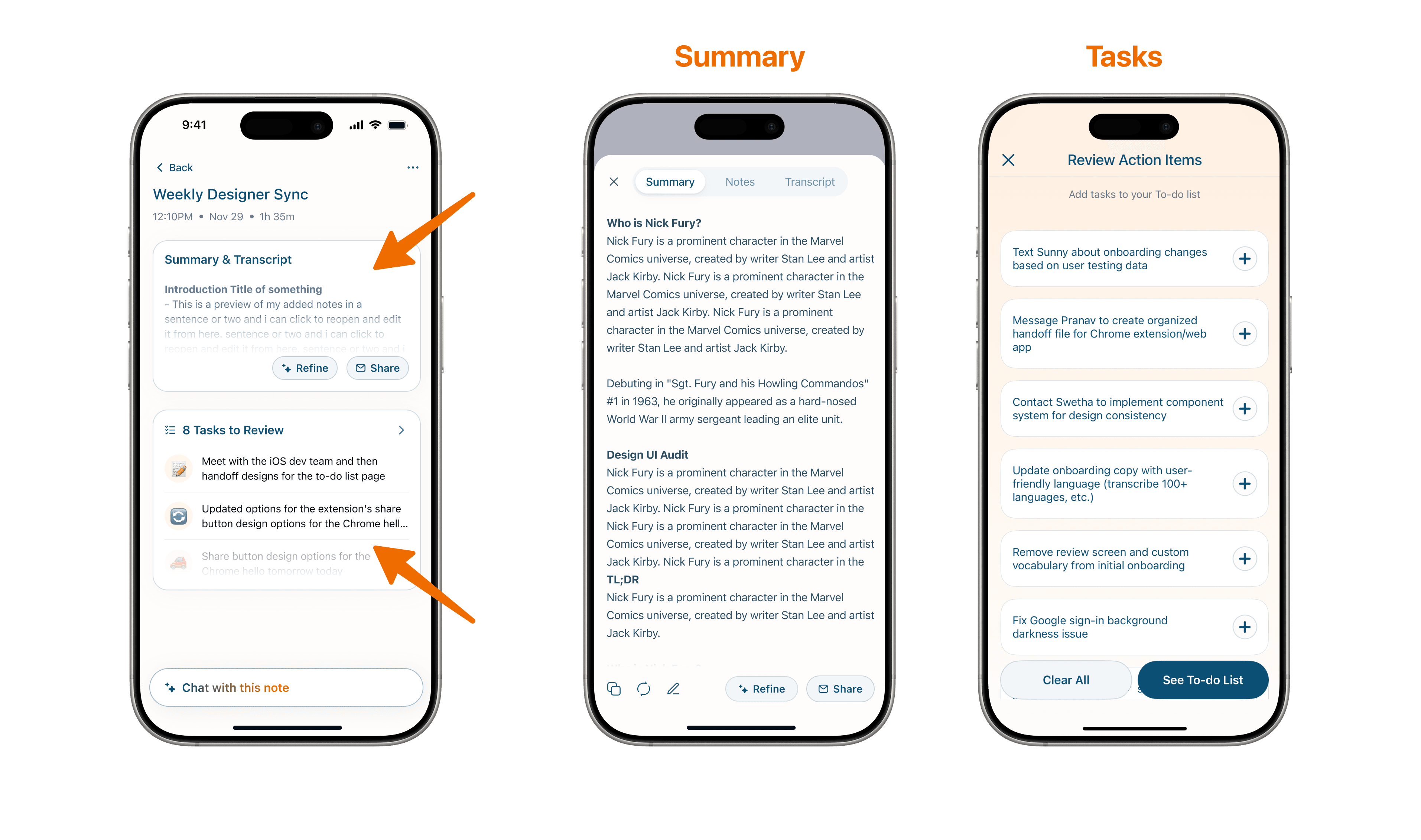 Once you hit stop, you'll get a detailed summary, action items, and a full transcript.